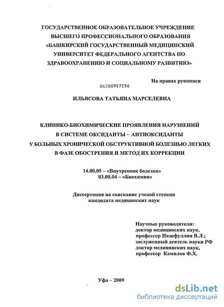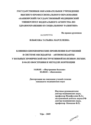 Диссертация апробирована на совместном заседании проблемной комиссии «Внутренние болезни» и кафедр терапии и общей врачебной практики с курсом гериатрии и подготовки: студентов терапевтического профиля; биологической и биоорганической химии, сестринского дела с уходом за больными^ пропедевтики внутренних болезней с курсом: физиотерапии Государственного образовательного учреждения высшего профессионального ' образования? «Башкирский государственный медицинский университет Росздрава» (протокол от 27 марта 2009 года №3).