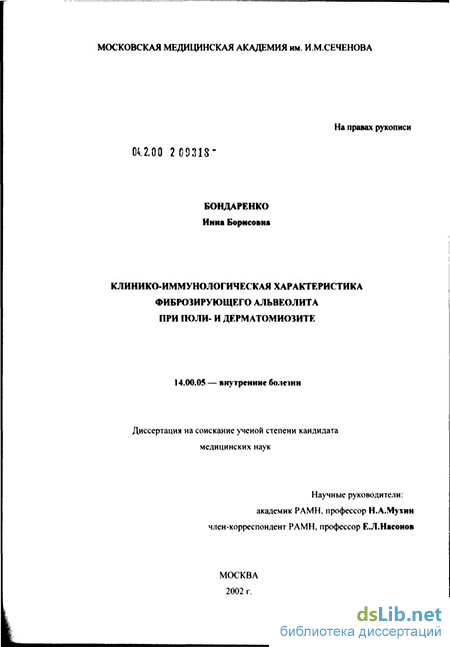 Бондаренко Инна Борисовна. Клинико-иммунологическая характеристика фиброзирующего альвеолита при поли- и дерматомиозите : диссертация ... кандидата медицинских наук : 14.00.05 / Бондаренко Инна Борисовна; [Место защиты: Государственный институт усовершенствования врачей].- Москва, 2002.- 149 с.: ил.