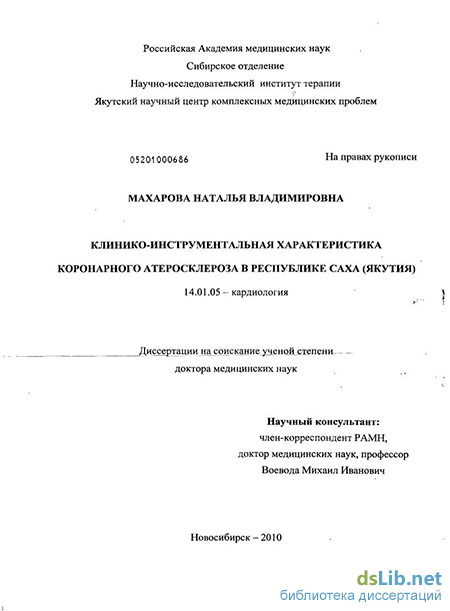 В последнее время убедительно показано, что клинические проявления атеросклероза не всегда коррелируют с его выраженностью. В ряде случаев он может длительное время не проявляться тяжелыми сосудистыми катастрофами, так как развитие острых коронарных событий ассоциируется не столько со степенью стеноза коронарных артерий, сколько с формированием нестабильной бляшки (Ambrose J.A., 1987; Никитин Ю.П., 2008; Бокерия Л.А., 2004; Лутай М.И., 2006; Рагино Ю.И., 2008). В том числе при наличии стабильной стенокардии, обусловленной выраженным стенозом коронарных сосудов, не обязательно развивается острый инфаркт миокарда (Nagvi T.Z. et.al., 1997; Chatzizisis Y.S. et.al., 2008; Shah R.K., 2005). Представляется весьма вероятным, что механизмы развития атеросклероза и его осложнений могут характеризоваться выраженной специфичностью в разных этнических группах и при проживании в контрастных климато-географических и социально-экономических условиях. Исследований, посвященных изучению клинических особенностей коронарного атеросклероза у жителей PC (Я), проживающих на территории с наиболее суровыми на планете климатическими условиями, в том числе с учетом этнических особенностей не выполнялось.