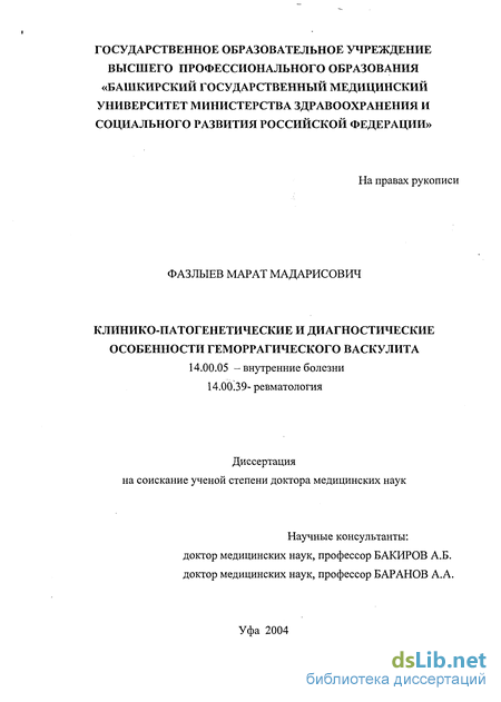 Фазлыев Марат Мадарисович. Клинико-патогенетические и диагностические особенности геморрагического васкулита : диссертация ... доктора медицинских наук : 14.00.05 / Фазлыев Марат Мадарисович; [Место защиты: Государственное образовательное учреждение высшего профессионального образования "Башкирский государственный медицинский университет"].- Уфа, 2004.- 181 с.: ил.