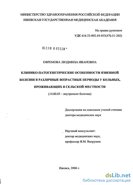 Ефремова Людмила Ивановна. Клинико-патогенетические особенности язвенной болезни в различные возрастные периоды у больных, проживающих в сельской местности : диссертация ... доктора медицинских наук : 14.00.05 / Ефремова Людмила Ивановна; [Место защиты: Центральный научно-исследовательский институт гастроэнтерологии].- Москва, 2006.- 274 с.: ил.