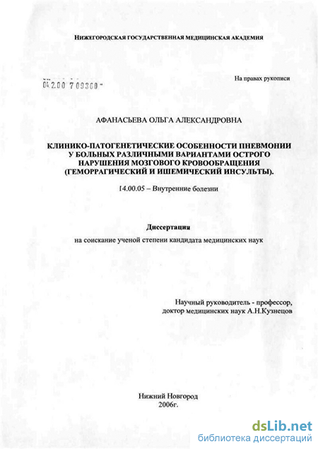 Афанасьева Ольга Александровна. Клинико-патогенетические особенности пневмонии у больных различными вариантами острого нарушения мозгового кровообращения (геморрагический и ишемический инсульт) : диссертация ... кандидата медицинских наук : 14.00.05 / Афанасьева Ольга Александровна; [Место защиты: ГОУВПО "Нижегородская государственная медицинская академия"].- Нижний Новгород, 2006.- 0 с.: ил.