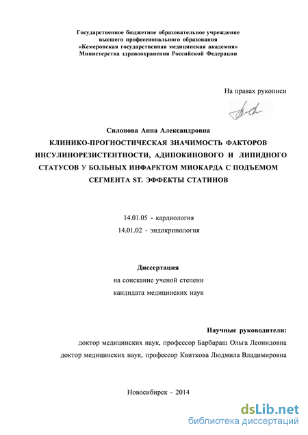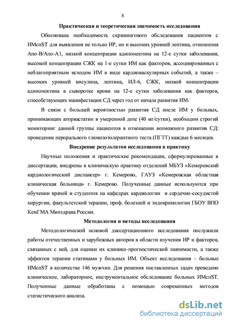 Высокая диагностическая ценность в прогнозе развития кардиоваску-лярных событий в течение года после ИМспST принадлежит: индексу HOMA-IR, уровням лептина, адипонектина, СЖК, отношению Апо-В/Апо-А1, определенных в госпитальном периоде ИМ. Риск развития СД через год после ИМспST ассоциирован с индексом HOMA-IR, уровнями инсулина, лептина, адипонектина, ИЛ-6, СЖК в сыворотке крови, оцененными в госпитальном периоде ИМ.