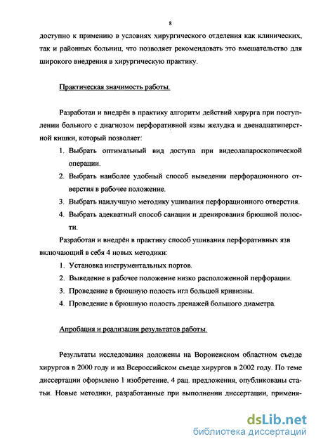 Результаты исследования доложены на Воронежском областном съезде хирургов в 2000 году и на Всероссийском съезде хирургов в 2002 году. По теме диссертации оформлено 1 изобретение, 4 рац. предложения, опубликованы статьи. Новые методики, разработанные при выполнении диссертации, применя ются во 2 городской клинической больнице при лечении больных поступающих с диагнозом перфоративной язвы желудка и двенадцатиперстной кишки.