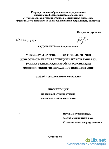 Учитывая изложенные факты можно предположить, что воздействие кадмия влияет на хроноструктуру, модифицируя её, вызывает нарушение функционирования регуляторных систем (нервной, эндокринной), которое выражается в нарушении естественной хроноструктуры данных систем и вызывает рассогласование ритмов. Представлялось целесообразным изучить циркадианную организацию ряда физиологических процессов как в клинических исследованиях жителей химически загрязненного региона, так и при моделировании на животных с проведением экспериментальной терапии пептидом АКТГ4-ю(семакс), обладающим нейропротекторным действием.