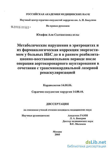 Юсифов Али Солтангамид оглы. Метаболические нарушения в эритроцитах и их фармакологическая коррекция энергостимом у больных ИБС до и в раннем реабилитационно-восстановительном периоде после операции аортокоронарного шунтирования [Электронный ресурс] : Диссертация ... кандидата медицинских наук : 14.00.06