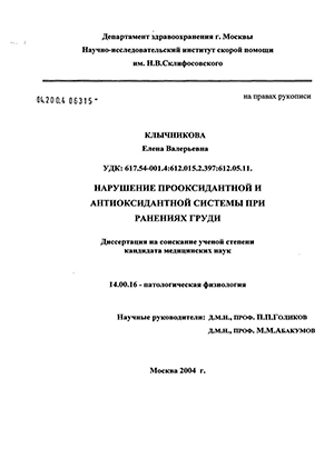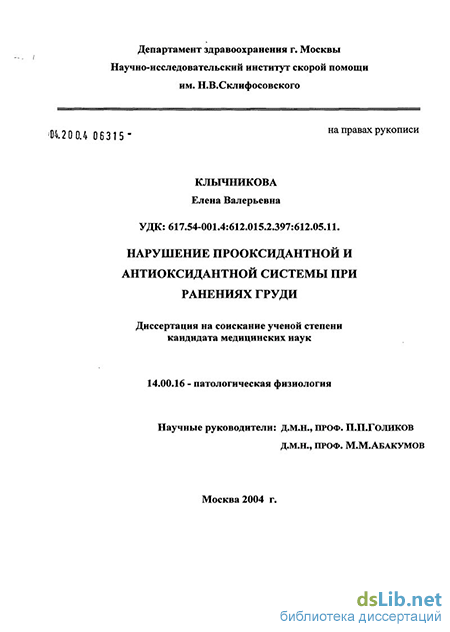 глутатионпероксидаза и СОД) в качестве дополнительных патогенетических критериев в комплексной оценке тяжести состояния и прогноза у пострадавших с ранениями груди.