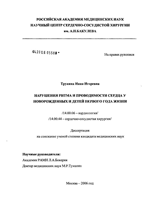 Трунина Инна Игоревна. Нарушения ритма и проводимости сердца у новорожденных и детей первого года жизни : диссертация ... кандидата медицинских наук : 14.00.06 / Трунина Инна Игоревна; [Место защиты: Научный центр сердечно-сосудистой хирургии РАМН].- Москва, 2006.- 116 с.: ил.
