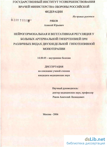 Выводы и практические рекомендации диссертации используются в лечении и диагностике артериальной гипертензии у больных в ГВКГ им. Н.Н. Бурденко, 9 ЛДЦ МО РФ, они также нашли свое применение в лекционном материале кафедры терапии ГИУВ МО РФ.