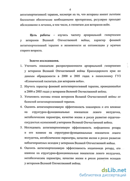 Мета-анализ 29 крупных рандомизированных клинических исследований с .участием более 160 тысяч больных АГ показал уменьшение риска сердечно-сосудистых осложнений и смертности, главным образом, связанных со степенью снижения артериального давления (АД) (Blood Pressure Lowering..., 2003). Однако имеются сведения, что эффективность отдельных классов антигипертензивных препаратов в предупреждении коронарных и церебральных событий значительно отличается (В. Dahlof et. al., 2002, 2005), (P.Verdecchia et. al., 2005). Это указывает на необходимость выбора таких препаратов, которые наилучшим образом подходили бы для лечения АГ пациентов пожилого и старого возраста и обеспечивали снижение рисканеблагоприятных исходов. Способность антипшертензивной терапии уменьшать сердечно-сосудистые осложнения уже установлена для пациентов среднего и пожилого возраста. Однако достаточных доказательств этому еще не получено для пациентов старого и очень старого возраста (С. Bulpitt, 2003). Существенная часть в когорте очень старых людей в Краснодарском крае представлена ветеранами Великой Отечественной войны (ВОВ). В настоящее время по данным Крайстатуправления в крае проживает более 32 тысяч инвалидов и участников ВОВ.