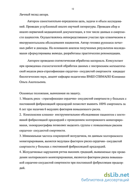 Автором проведена статистическая обработка материала. Консультант при проведении статистической обработки данных с построением математической модели риск-стратификации сердечно- сосудистой смертности кандидат биологических наук, доцент кафедры педагогики ВМШ СПбМАПО Клиценко Ольга Анатольевна.