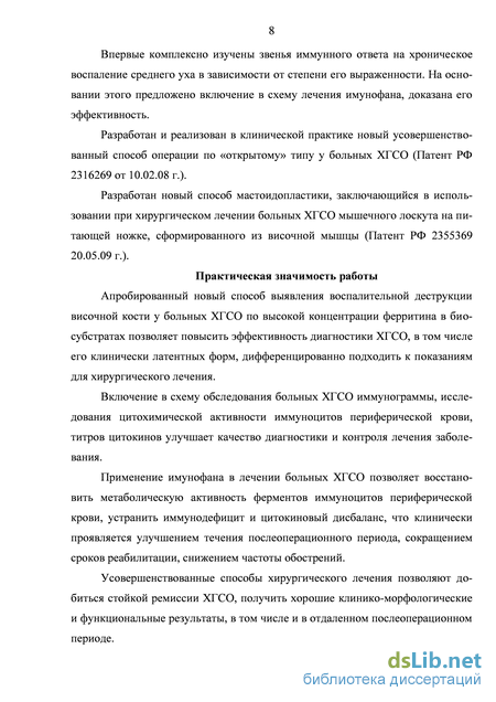 Разработан новый способ мастоидопластики, заключающийся в использовании при хирургическом лечении больных ХГСО мышечного лоскута на питающей ножке, сформированного из височной мышцы (Патент РФ 2355369 20.05.09 г.).