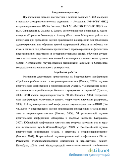 Материалы диссертации представлены на Всероссийской конференции «Проблема реабилитации в оториноларингологии» (Самара, 2003); научно-практической конференции с международным участием “Современные вопросы диагностики и реабилитации больных с тугоухостью и глухотой” (Суздаль, 2006); XVII съезда оториноларингологов РФ (Н.Новгород, 2006); Всероссийской конференции «Актуальные вопросы современной хирургии» (Астрахань, 2006); II-й научно-практической конференции оториноларингологов ЮФО (Сочи, 2006); V Всероссийской научно-практической конференции «Наука и практика в оториноларингологии» (Москва, 2006); VI региональной научно-практической конференции «Лекарство и здоровье человека» (Астрахань, 2007); Юбилейной конференции «Актуальные вопросы патологии уха и верхних дыхательных путей» (Санкт-Петербург, 2007); VI Всероссийской научно-практической конференции «Наука и практика в оториноларингологии» (Москва, 2007); Всероссийской научно-практической конференции «100 лет Российской оториноларингологии: достижения и перспективы» (Санкт-Петербург, 2008); 6-ой Международной научно-практической конференции «Достижения фундаментальных наук в решении актуальных проблем медицины» (Астрахань, 2008); VII Всероссийской научно-практической конференции «Наука и практика в оториноларингологии» (Москва, 2008); III научно-практической конференции оториноларингологов Центрального федерального округа Российской Федерации «Актуальное в оториноларингологии» (Москва, 2009); VIII Всероссийском конгрессе оториноларингологов «Наука и практика в оториноларингологии» (Москва, 2009); 8-й научно-практической конференции врачей Карачаево-Черкесской Республики «Актуальные вопросы практического здравоохранения», (Черкесск, 2010); научно-практической конференции с международным участием «Передовые технологии диагностики и лечения в оториноларингологии» (Томск 2011); 10-й научно-практической конференции врачей Карачаево-Черкесской Республики «Актуальные вопросы практического здравоохранения» (Черкесск, 2012); ежегодных научно-практических конференциях сотрудников АГМА (Астрахань, 2006, 2007, 2008, 2009, 2013); заседаниях областного научно-медицинского общества оториноларингологов (2004, 2005, 2006, 2007, 2008, 2009, 2010).