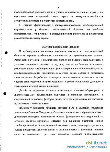 Впервые у пациентов пожилого возраста с АГ в условиях стационара дневного пребывания Самарского областного клинического кардиологического диспансера проведена клиническая оценка функциональных нарушений со стороны сердечно-сосудистой системы под влиянием различных видов комбинированной антигипертензивной фармакотерапии, дана характеристика и оценка показателей качества жизни с позиции нормы и патологии, понятий сано- и патогенеза: При этом выделены наиболее информативные