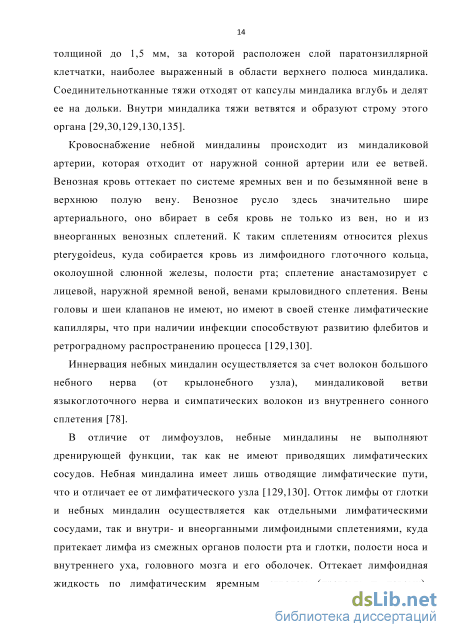 Кровоснабжение небной миндалины происходит из миндаликовой артерии, которая отходит от наружной сонной артерии или ее ветвей. Венозная кровь оттекает по системе яремных вен и по безымянной вене в верхнюю полую вену. Венозное русло здесь значительно шире артериального, оно вбирает в себя кровь не только из вен, но и из внеорганных венозных сплетений. К таким сплетениям относится plexus pterygoideus, куда собирается кровь из лимфоидного глоточного кольца, околоушной слюнной железы, полости рта; сплетение анастамозирует с лицевой, наружной яремной веной, венами крыловидного сплетения. Вены головы и шеи клапанов не имеют, но имеют в своей стенке лимфатические капилляры, что при наличии инфекции способствуют развитию флебитов и ретроградному распространению процесса [129,130].