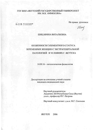 Апробация работы: материалы диссертации с основными выводами и практическими рекомендациями, вытекающими из полученных результатов, неоднократно докладывались и обсуждались на форумах ученых и практических врачей, в периоды 2005-2006 гг., в том числе, X Всероссийском конгрессе «Экология и здоровье человека» (Самара, октябрь, 2005); научно-практической конференции «Реализация национального проекта в сфере здравоохранения и медицинского образования в РС(Якутия)» (Якутск, июнь, 2006); на совместном заседании сотрудников Центра Биотической медицины и кафедры нутрициологии и биоэлементологии Оренбургского государственного университета (Москва, июнь, 2006); на совместном заседании кафедр физиологии человека, педиатрии, акушерства и гинекологии МИ ЯГУ (Якутск, октябрь,2006).