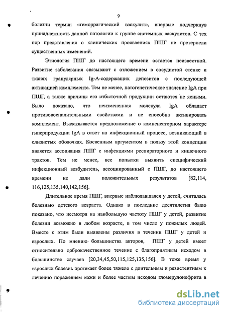 Этиология ГПТТГ до настоящего времени остается неизвестной. Развитие заболевания связывают с отложением в сосудистой стенке и тканях гранулярных Ig-A-содержащих депозитов с последующей активацией комплемента. Тем не менее, патогенетическое значение IgA при ГТТЇІГ, а также причины его избыточной продукции остаются не ясными. Было показано, что неизмененная молекула IgA обладает противовоспалительными свойствами и не способна активировать комплемент. Высказывается предположение о компенсаторном характере гиперпродукции IgA в ответ на инфекционный процесс, возникающий в слизистых оболочках. Косвенным аргументом в пользу этой концепции является ассоциация ПТІ.ІГ с инфекциями респираторного и кишечного трактов. Тем не менее, все попытки выявить специфический инфекционный возбудитель, ассоциированный с ГПТГГ, до настоящего времени не дали положительных результатов [82,114, 116,125,135,140,142,156].
