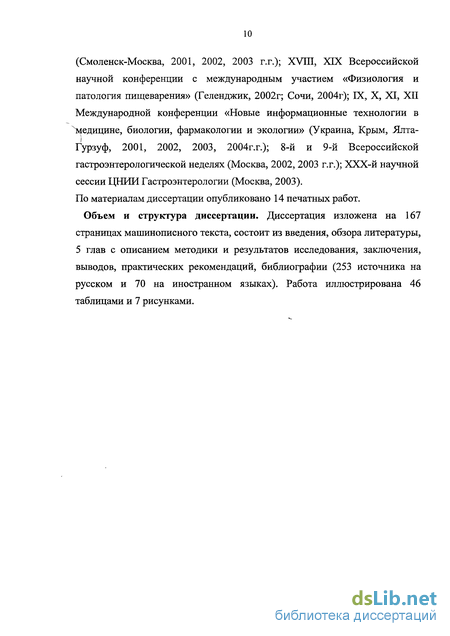 (Смоленск-Москва, 2001, 2002, 2003 г.г.); XVIII, XIX Всероссийской научной конференции с международным участием «Физиология и патология пищеварения» (Геленджик, 2002г; Сочи, 2004г); IX, X, XI, XII Международной конференции «Новые информационные технологии в Медицине, биологии, фармакологии и экологии» (Украина, Крым, Ялта-Гурзуф, 2001, 2002, 2003, 2004г.г.); 8-й и 9-й Всероссийской гастроэнтерологической неделях (Москва, 2002, 2003 г.г.); ХХХ-й научной сессии ЦНИИ Гастроэнтерологии (Москва, 2003). По материалам диссертации опубликовано 14 печатных работ.