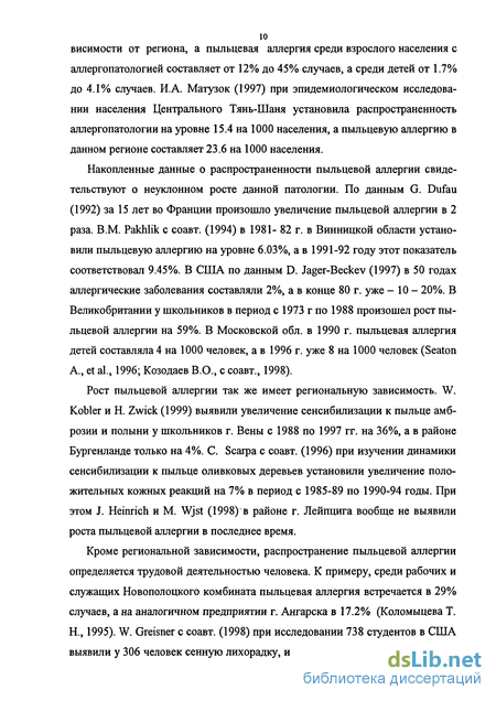 Аналогично высокий уровень пыльцевой аллергии выявляется среди детей за рубежом. В Сербии поллиноз определяется у 1.17% детей с аллергопа-тологией, в Грузии у 3.3%, в Юго-Западной Германии у 5.9 - 11.4%, во Франции у 43.8% детей положительные реакции на пыльцевые аллергены (Kavu ric-Hafher С, Matika-Setic A., 1992; Kuhr J., 1999; belong M. et al., 1995; Жоржолиани Л., 1999).