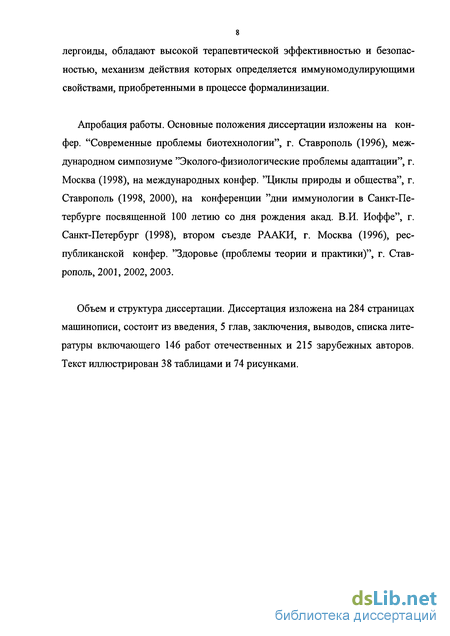 Апробация работы. Основные положения диссертации изложены на кон-фер. "Современные проблемы биотехнологии", г. Ставрополь (1996), международном симпозиуме "Эколого-физиологические проблемы адаптации", г. Москва (1998), на международных конфер. "Циклы природы и общества", г. Ставрополь (1998, 2000), на конференции "дни иммунологии в Санкт-Петербурге посвященной 100 летию со дня рождения акад. В.И. Иоффе", г. Санкт-Петербург (1998), втором съезде РААКИ, г. Москва (1996), республиканской конфер. "Здоровье (проблемы теории и практики)", г. Ставрополь, 2001, 2002, 2003.