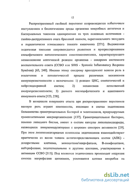 Гнойное воспаление брюшины продолжает оставаться основной причиной смерти больных с острой хирургической патологией и травмами органов брюшной полости [1, 25, 296]. Течение перитонита, характер и особенности гнойных послеоперационных осложнений определяются не только тяжестью основного патологического процесса, адекватностью выполненного оперативного вмешательства и полнотой проводимого послеоперационного лечения. Во многом они зависят от характера происходящих изменений в таких защитных системах как иммунитет, гемостаз и неспецифическая резистентность организма [2, 33, 72, 78]. Не претендуя на полноту освещения патогенеза перитонита, мы попытались обобщить литературные данные о нарушениях вышеназванных защитных систем. Массивная бактериальная токсемия, оперативные вмешательства, «ударный» характер антибактериальной терапии, использование в послеоперационном периоде глюкокортикоидов, большое количество рентгенологических исследований способствуют развитию некорригируемых изменений в иммунной системе с возникновением полифункциональной недостаточности ее важнейших органов и систем [29, 30, 291]. Комбинированный вторичный иммунодефицит у таких больных имеет в своей основе все ключевые патологические изменения в системе иммунитета: гибель клеток (некроз, апоптоз); функциональную клеточную блокаду (блокаду рецепторов и блокаду передачи сигналов); дисбаланс клеточных субпопуляций - хелперов (Thi/Th2); хелперов/цитотоксических лимфоцитов) [137]. Распространенный гнойный перитонит сопровождается избыточным поступлением в биологические среды организма микробных антигенов и бактериальных токсинов одновременно из трех основных источников - гнойно-деструктивного очага брюшной полости, перитонеального экссудата и паралитически измененного тонкого кишечника [271]. Выраженная эндогенная токсемия сопровождается развитием и прогрессированием специфического патологического симптомокомплекса, характеризующего возникновение септической реакции организма - синдрома системного воспалительного ответа (ССВО или SIRS - Systemic Inflammatory Response Syndrom) [63, 240]. Именно этому синдрому принадлежит важная роль в вовлечении в патологический процесс различных механизмов иммунорезистентности с включением: 1) реакции ЦНС, симпатической и нейроэндокринной систем; 2) механизмов естественной иммунорезистентности; 3) раннего неспецифического и адаптивного иммунного ответа [123, 238]. В инициации иммунного ответа при распространенном перитоните важную роль играют компоненты, входящие в состав эндотоксина большинства грамотрицательных бактерий и экзотоксинов, продуцируемых грампозитивными микроорганизмами [137]. Грамотрицательные бактерии, помимо липидного бислоя, имеют в составе капсулы липополисахариды, являющиеся иммуномодуляторами с широким спектром активности [29]. При этом липополнсахаридпые комплексы эндотоксинов взаимодействуют практически со всеми типами антигенпредставляющих клеток (АПК) -дендритными клетками, моноцитами/макрофагами, В-лимфоцитами, нейтрофилами, эндотелиальными и другими клетками, участвующими в активации ССВО [313]. Под влиянием эндотоксинов происходит индукция синтеза макрофагами цитокинов, усиливается адгезия микробов на эндотелиальных клетках и лимфоцитах [167]. При этом возрастает экспрессия корецепторов лимфоц