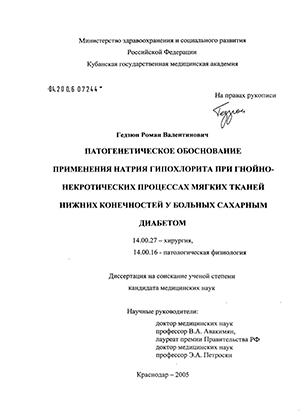 Новизна результатов исследования Впервые проведена сравнительная оценка детоксицируюшей эффективности внутривенного применения натрия гипохлорита и антибиотиков широкого спектра действия и дана характеристика предлагаемого метода лечения больных с гнойно-некротическими заболеваниями мягких тканей нижних конечностей при сахарном диабете. Впервые изучено влияние натрия гипохлорита в комплексе с антибиотиками на реологические свойства крови и оксигенацию тканей в условиях макро- и микроангиопатии. В результате проведенных исследований разработан комплекс лечебно-профилактических мероприятий, включающий использование натрия гипохлорита и антибиотиков широкого спектра действия в лечении гнойно-