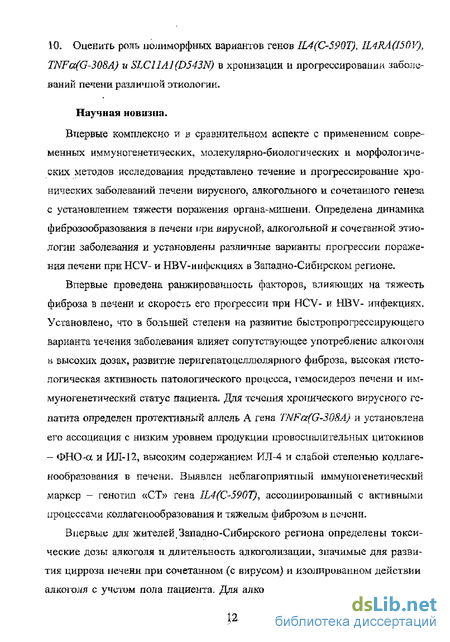 Впервые комплексно и в сравнительном аспекте с применением современных иммуногенетических, молекулярно-биологических и морфологических методов исследования представлено течение и прогрессирование хронических заболеваний печени вирусного, алкогольного и сочетанного генеза с установлением тяжести поражения органа-мишени. Определена динамика фиброзообразования в печени ігри вирусной, алкогольной и сочетанной этиологии заболевания и установлены различные варианты прогрессии поражения печени при HCV- и HBV-инфекциях в Западно-Сибирском регионе.