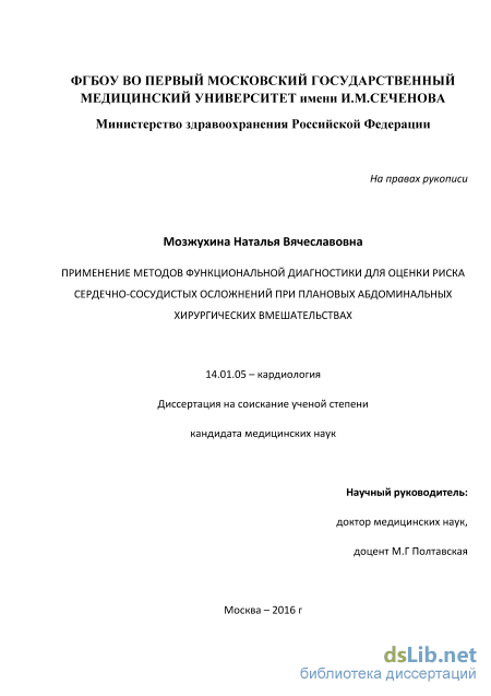 Методики инструментальных исследований Обследование пациентов выполнялось по следующим методикам: 1) Регистрация электрокардиограммы в покое в 12-ти отведениях на кардиографе «GE MAC3500, США». ЭКГ регистрировали со скоростью 25 мм/с в масштабе 1 мВ=1 см. Оценивались параметры ЭКГ с выделением следующих: – патологический зубец Q, – признаки гипертрофии ЛЖ – неспецифические изменения сегмента ST и зубца Т, – удлинение интервала QRS 0,12 мсек, QTc 440 мсек для мужчин и 450 для женщин (формула Базета). 2) Трансторакальная эхокардиография на аппарате «Dimension/Vivid 7 PRO» фирмы «General Electric Medical System». Проводилась оценка: – размеров и объемов желудочков и предсердий и их индексов, – толщины межжелудочковой перегородки и задней стенки ЛЖ, – фракции выброса по методу Simpson, – интеграла линейной скорости кровотока на выносящем тракте ЛЖ (VTI) – скорости раннего (Е) и предсердного (А) наполнения ЛЖ, – показателей тканевой допплерэхоКГ: скорости ранне- и позднедиастолического движения кольца митрального клапана (e и a ), отношение E/e . – глобальной продольной деформации миокарда методом speckle tracking ( в 2-х камерной, 4-х камерной и апикальной позиции). – скоростных показателей и градиентов на клапанах сердца; выраженность регургитации и наличие стенозов клапанов; – параметров легочной гипертензии (косвенная оценка систолического давления в ЛА, время ускорения потока на клапане легочной артерии) При определении диастолической дисфункции ЛЖ использовали соответствующие рекомендации 2009г [98]. 3) Суточное мониторирование ЭКГ выполнялось на регистраторе «Schiller MT 101» (рабочая станция «Schiller Medical System») в 3 каналах ЭКГ. Оценивались: ритм, максимальная, минимальная и средняя ЧСС за сутки; наличие пауз, нарушений ритма и проводимости, анализировалась динамика сегмента ST. 4) Исследование функции внешнего дыхания с использованием системы SCHILLER CS-200, Швейцария. 5) Нагрузочный тест с газовым анализом (эргоспирометрия). Противопоказания к эргоспирометрии в основном соответствовали критериям исключения, тест также не проводился у пациентов с выраженной общей слабостью или патологией опорно-двигательного аппарата, препятствующей выполнению теста. При выборе вида протокола ориентировались на пол, возраст и тяжесть сердечно-сосудистой или другой патологии. Пациентам старше 75 лет и/или низким уровнем физической активности, а также с ХСН I функционального класса предлагался протокол Bruce Modified. Пациентам с более тяжелыми функциональными нарушениями предлагался протокол Weak. Остальным пациентам предлагалось выполнить протокол Bruce. Характеристики протоколов представлены в приложении № 2.