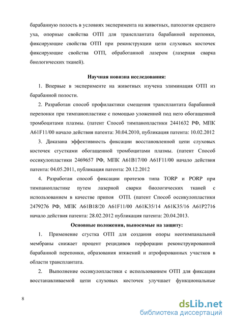 Разработан способ профилактики смещения трансплантата барабанной перепонки при тимпанопластике с помощью уложенной под него обогащенной тромбоцитами плазмы. (патент Способ тимпанопластики 2441632 РФ, МПК A61F11/00 начало действия патента: 30.04.2010, публикация патента: 10.02.2012