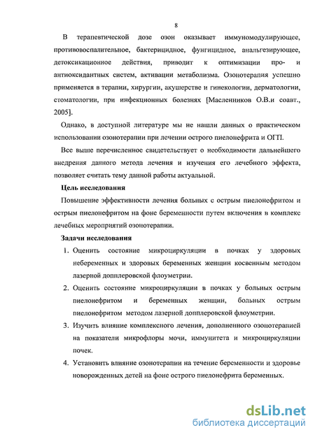 Повышение эффективности лечения больных с острым пиелонефритом и острым пиелонефритом на фоне беременности путем включения в комплекс лечебных мероприятий озонотерапии.