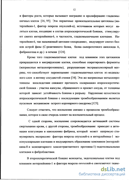 Источниками повышенного уровня ФНО-а у больных с ОКС могут быть клетки, входящие в состав самой атеросклеротической бляшки (макрофаги, эндотелиальные и гладкомышечные клетки) [44]. Согласно современных данным у большинства больных с ОКС обнаруживают не одну поврежденную атеросклеротическую бляшку, являющуюся патоморфологи-ческой основой клинической симптоматики, а несколько, так называемых ранимых (склонных к повреждению) атеросклеротических бляшек [34,85,170]. О.П. Шевченко и соавт. (2005) в своей работе говорят о концепции мульти-фокальной ранимости атеросклеротических бляшек, при этом роль «дирижеров» одновременных изменений в атеросклеротических бляшках могут выполнять маркеры воспаления, некоторые из них способны оказывать системный эффект и индуцировать активность воспаления в сосудистых областях, расположенных на удалении от бляшки. В частности, провоспалитель-ные цитокины, вырабатываемые макрофагами при активации воспалительного процесса в атеросклеротической бляшке, могут индуцировать активность макрофагов в бляшках, расположенных в других участках коронарного русла или в других сосудистых областях [34], тем самым вызывая неблагоприятные сердечно-сосудистые события у больных в краткосрочной перспективе.