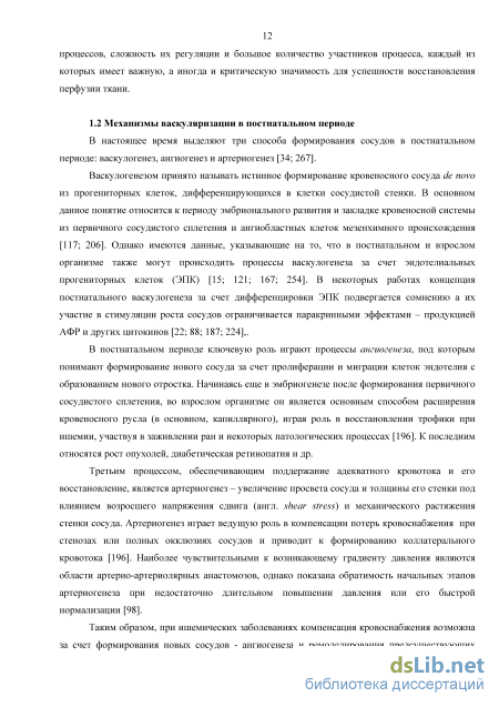 Васкулогенезом принято называть истинное формирование кровеносного сосуда de novo из прогениторных клеток, дифференцирующихся в клетки сосудистой стенки. В основном данное понятие относится к периоду эмбрионального развития и закладке кровеносной системы из первичного сосудистого сплетения и ангиобластных клеток мезенхимного происхождения [117; 206]. Однако имеются данные, указывающие на то, что в постнатальном и взрослом организме также могут происходить процессы васкулогенеза за счет эндотелиальных прогениторных клеток (ЭПК) [15; 121; 167; 254]. В некоторых работах концепция постнатального васкулогенеза за счет дифференцировки ЭПК подвергается сомнению а их участие в стимуляции роста сосудов ограничивается паракринными эффектами - продукцией АФР и других цитокинов [22; 88; 187; 224],.