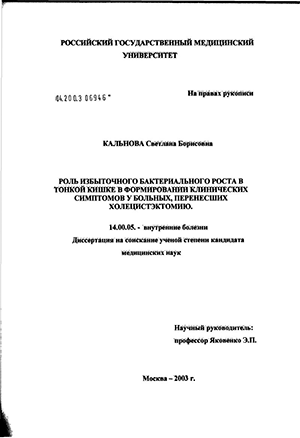 Кальнова Светлана Борисовна. Роль избыточного бактериального роста в тонкой кишке в формировании клинических симптомов у больных, перенесших холецистэктомию : диссертация ... кандидата медицинских наук : 14.00.05 / Кальнова Светлана Борисовна; [Место защиты: Российский государственный медицинский университет].- Москва, 2003.- 140 с.: ил.