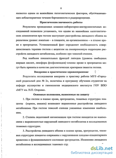 Результаты проведенных клинико-лабораторно-инструментальных исследований позволили установить, что одним из важнейших патогенетических компонентов при гестозе выступают расстройства липидного обмена на различном уровне: локально - в плаценте, на организменном - в плазме крови и эритроцитах. Установленный факт определяет необходимость совершенствовать терапию гестоза с акцентом нахвоевременную коррекцию расстройств липидного метаболизма, особенно при тяжелой степени.