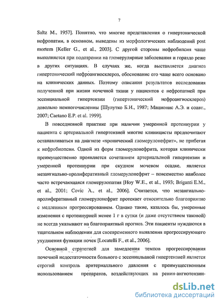 Saltz M., 1957]. Понятно, что многие представления о гипертонической нефропатии, в основном, выведены из морфологических наблюдений post mortem [Keller G., et al., 2003]. С другой стороны нефробипсия чаще выполняется при подозрении на гломерулярные заболевания и гораздо реже в других ситуациях. В случаях же, когда выставляется диагноз гипертонический нефроангиосклероз, обоснование его чаще всего основано на клинических данных. Поэтому описания результатов исследования полученной при жизни почечной ткани у пациентов с нефропатией при эссенциальной гипертензии (гипертонический нефроангиосклероз) довольно немногочисленны [Шулутко Б.И., 1987; Мационис А.Э. и соавт., 2007; Caetano Е.Р. et al. 1999].