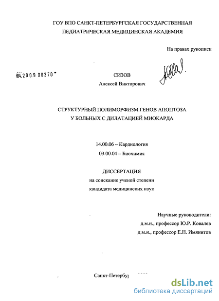 числа ранее изученных генов. Носительство некоторых полиморфных аллелей, как выяснилось при исследовании генов ренин-ангиотензиновой системы, аполипопротеиновых генов и ряда других, может предрасполагать к развитию заболеваний сердечно-сосудистой системы - таких, как атеросклероз, ИБС и гипертоническая болезнь. В то же время поиск ассоциаций между структурными особенностями ДНК генов апоптоза и заболеваниями сердца и сосудов только начинается. Вопрос же о роли полиморфных аллелей генов апоптоза в развитии дилатации миокарда остается не изученным.