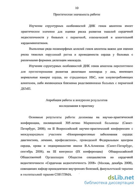 Изучение структурных особенностей ДНК генов апоптоза имеет практическое значение для оценки риска развития тяжелой сердечной недостаточности у больных с первичной, ишемической и алкогольной кардиомиопатиями.