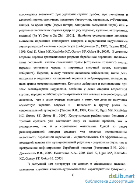 Согласно данным ряда авторов внезапное изменение давления, чаще при баротравмах может вызвать разрыв барабанной перепонки, в первую очередь в задних квадрантах [2,4,14,39,53]. Систематические наблюдения- показывают, что размеры перфораций в ряде случаев не постоянны и имеют тенденцию к уменьшению, но нередко изменяется и в сторону увеличения [64,68,77]. Уменьшение перфорации в ряде случаев объяснятся не рубцеванием, а соединением краев разрыва, разъединившихся и вдавленных внутрь травматическим агентом. При щелевидных перфорациях иногда наблюдается превращение щелевидного отверстия в перфорацию округлой формы и значительных размеров [1,12]. Перфорации барабанной перепонки примерно в 60% случаев сопровождаются развитием воспалительного процесса в среднем ухе [108]. Отит обычно возникает в, ближайшие после травмы дни, хотя нередко и в отсроченном периоде [130]. Возникновение отита связывают как с инфицированием среднего уха через перфорацию, так и через слуховую трубу [145]. Зачастую дети с данной патологией, находящиеся на лечение в отоларингологическом стационаре остаются без должного внимания. Ребенок в течение 2х недель получает консервативное лечение — антибактериальную терапию, капли или мази местно в слуховой проход [7,23,25,145]. Данная категория больных после выписки из стационара или при амбулаторном наблюдении в отсроченном периоде не осматривается отоларингологом, не исследуется слух [17,21,35,46,55]. Зачастую дети, получившие сочетанные тяжелые травмы и повреждения органов и систем, получающие лечение в отделении травматологии и нейрохирургии не осматриваются ЛОР врачом [23,52,58]. Ввиду тяжести основного заболевания, вестибулярные расстройства рассматриваются как явления вегето-сосудистой дистонии, что на самом деле может оказаться последствием поражения лабиринта, которое в свою очередь приводит к тому, что дети попадают в группу риска по сенсоневральной тугоухости [58,132]. 15% детей с хроническими отитами имели в анамнезе эпизод травматического разрыва барабанной перепонки [45,50,132]. Хронические гнойные средние отиты являются распространенным заболеванием и среди причин тугоухости занимают одно из ведущих мест [130]. В основе поражения среднего, а иногда и внутреннего уха, лежит нарушение целостности барабанной перепонки, системы среднего уха в. последствие травмы [21,51,105]. У значительной части больных с травмой среднего уха отмечаются изменения со стороны барабанной перепонки, начиная от поверхностных кровоизлияний и кончая обширными дефектами перепонки [33,65,109]. Эти изменения представляют собой объективные доказательства, имевшего места воздействия на барабанную перепонку [19,27,115]. Травма среднего уха с разрывом барабанной перепонки является необратимым или временным повреждением [9,27]. Основным фактором, травмы барабанной перепонки является изменение давления воздуха в наружном слуховом проходе и неспособностью барабанной перепонки адекватно реагировать на эти изменения [46,50]. Отмечают, что даже при, небольших травматических разрывах барабанной перепонки в. барабанной полости могут выявляться более серьезные патологические повреждения: возможен разрыв слизистой оболочки в области лабиринтных окон, вывих слуховых косточек, приводящий к нарушению слуха и патологии вестибулярной системы [21,24,75,50,51,109]. Разрывы барабанной пер
