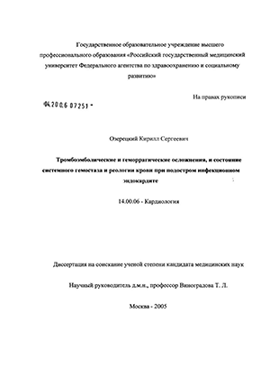 Озерецкий Кирилл Сергеевич. Тромбоэмболические и геморрагические осложнения и состояние системного гемостаза и реологии крови при подостром инфекционном эндокардите : диссертация ... кандидата медицинских наук : 14.00.06 / Озерецкий Кирилл Сергеевич; [Место защиты: ГОУВПО "Российский государственный медицинский университет"].- Москва, 2006.- 127 с.: ил.