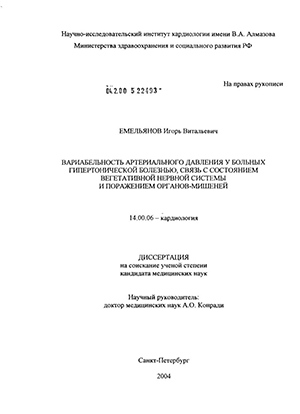 Емельянов Игорь Витальевич. Вариабельность артериального давления у больных гипертонической болезнью, связь с состоянием вегетативной нервной системы и органов-мишеней : диссертация ... кандидата медицинских наук : 14.00.06 / Емельянов Игорь Витальевич; [Место защиты: ГУ "Научно-исследовательский институт кардиологии"].- Санкт-Петербург, 2004.- 149 с.: ил.