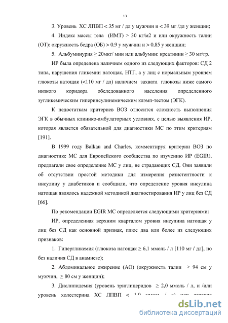 В 1988 году Всемирная организация здравоохранения (ВОЗ) попыталась стандартизировать критерии диагностики МС [191]. ВОЗ рассматривала ИР, как необходимый компонент для диагностики МС. По ее критериям наличие ИР (основной критерий) плюс два из следующих факторов риска являлись необходимыми для диагностики МС: 1. Артериального давления (АД) (140 мм рт.ст. систолического и 90 мм рт.ст. диастолическое) и/или применение антигипертензивных препаратов; 2. Уровень ТГ плазмы 150 мг / дл; 3. Уровень ХС ЛПВП 35 мг / дл у мужчин и 39 мг /дл у женщин; 4. Индекс массы тела (ИМТ) 30 кг/м2 и или окружность талии (ОТ): окружность бедра (ОБ) 0,9 у мужчин и 0,85 у женщин; 5. Альбуминурия 20мкг/ мин или альбумин: креатинин 30 мг/гр. ИР была определена наличием одного из следующих факторов: СД 2 типа, нарушения гликемии натощак, НТГ, а у лиц с нормальным уровнем глюкозы натощак ( 110 мг / дл) наличием захвата глюкозы ниже самого низкого коридора обследованного населения определенного эугликемическим гиперинсулинемическим клэмп-тестом (ЭГК). К недостаткам критериев ВОЗ относится сложность выполнения ЭГК в обычных клинико-амбулаторных условиях, с целью выявления ИР, которая является обязательной для диагностики МС по этим критериям [191].