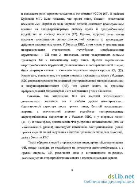 и повышают риск сердечно-сосудистых осложнений (ССО) (69). В работах Бубновой М.Г. было показано, что прием пищи, богатой животными насыщенными жирами (в виде жирных сливок) оказывает проатерогенное влияние на липид-транспортную систему крови и протромбогенное воздействие на систему гемостаза (12). Однако, здоровые лица имели высокую толерантность липид-транспортной системы к атерогенному действию насыщенных жиров. У больных КБС, в том числе, у которых риск прогрессирования атеросклероза усугублялся метаболическими нарушениями - СД типа 2, выявлялась низкая толерантность системы транспорта ХС к насыщенному жиру пищи. Причем выраженность атеротромбогенных нарушений, развивающихся в постпрандиальной стадии, была напрямую связана с тяжестью поражения атеросклерозом КА (12). Кроме того, установлено, что прием пищевых насыщенных жиров у больных КБС сопряжен с развитием латентной постпрандиальной гиперинсулинемиии и инсулинорезистентности (ИР), что может влиять на процессы прогрессирования атеросклероза и его осложнений у этих пациентов.