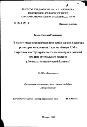Ратова Людмила Геннадьевна. Влияние терапии фиксированными комбинациями блокатора рецепторов ангиотензина II или ингибитора АПФ с диуретиком на структурное состояние миокарда и суточный профиль артериального давления у больных г : диссертация ... кандидата медицинских наук : 14.00.06 / Ратова Людмила Геннадьевна; [Место защиты: Российский кардиологический научно-производственный комплекс].- Москва, 2003.- 117 с.: ил.