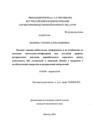 Шишова Татьяна Александровна. Влияние терапии небивололом, метформином и их комбинации на состояние гипоталамо-гипофизарной оси, суточный профиль артериального давления, вариабельность сердечного ритма, длительность QТ, углеводный : диссертация ... кандидата медицинских наук : 14.00.06 / Шишова Татьяна Александровна; [Место защиты: ФГУ "Российский кардиологический научно-производственный комплекс"].- Москва, 2009.- 150 с.: ил.