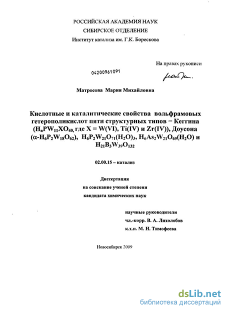 Целью работы является исследование кислотных и каталитических свойств вольфрамовых ГПК пяти структурных типов: 1) Кеггина (H3PW12O40, H4SiW12O40, HsPW„XO40, где X = Ті, Zr), 2) Доусона (a-H6P2Wl8062), 3) H6P2W2I07I, 4) H6As2W2,069 и 5) Н2ІВ3\У390ш. Установление взаимосвязи между кислотностью и каталитической активностью ГПК в реакции этерификации н-бутилового спирта уксусной кислотой и реакции де-трет-бутилирования2,6-ди-трет-бутил-4-метилфенола