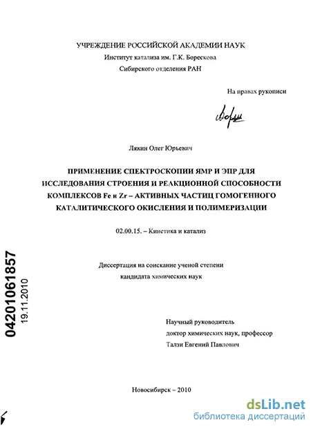 Личный вклад соискателя. Автор участвовал в постановке задач диссертационной работы, интерпретации спектроскопических данных, подготовке публикаций по теме диссертации. Автором был синтезирован ряд комплексов железа, разработаны методики экспериментов по каталитическому окислению циклогексена, усовершенствованы методики спектроскопических экспериментов. Все экспериментальные данные получены лично автором. Образцы каталитических систем для полимеризации пропилена, описываемые в четвертой главе, приготовлены к.х.н. сне. Семиколеновой Н. В.