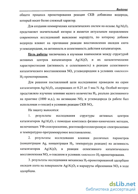 В настоящее время одной из наиболее перспективных систем для проведения СКВ являются катализаторы на основе Ag, нанесенного на А1203 (Ag/АІгОз). Однако температура реакции СКВ при использовании в качестве восстановителя углеводородов на этом типе катализаторов слишком высока (350 - 400С) для практического применения. Возможным методом увеличения их низкотемпературной активности (Т = 150 - 350С) может быть использование эффекта Нг-промотирования, заключающегося во введении в выхлопные газы водорода. Однако механизм этого промотирования, а также влияние ультрамалых количеств Н2 на селективность катализаторов остаются неясным, поэтому выяснение этих вопросов представляет значительный интерес для создания катализатора реакции низкотемпературного селективного восстановления N0, углеводородами.