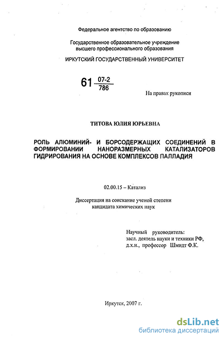 Апробация работы. Отдельные разделы диссертации докладывались на II Международной конференции «Highly- Organized Catalytic Systems» (Moscow, 2004), Всероссийской конференции «Молекулярный дизайн катализаторов и катализ в процессах переработки углеводородов и полимеризации» (г. Омск, 2005 г.), VII Российской конференции «Механизмы каталитических реакций» (Санкт – Петербург, 2006 г), Всероссийской конференции лауреатов Международного благотворительного научного фонда им. К. И. Замараева “Современные подходы к проблемам физикохимии и катализа” (Новосибирск, 2007 г).