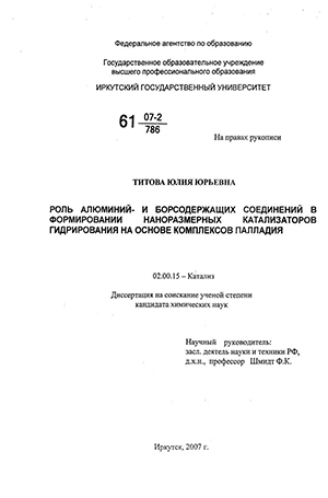 Целью данной работы является изучение химических аспектов формирования и природы катализаторов гидрирования на основе бис-ацетилацетоната палладия под действием Al- и В-содержащих соединений.