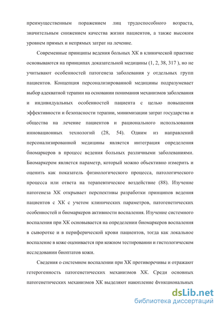 Современные принципы ведения больных ХК в клинической практике характеризуются эмпирическими подходами к терапии (Астафьева Н.Г. и др., 2009; Zuberbier T., 2009) и не учитывают особенностей патогенеза заболевания у отдельных групп пациентов. Концепция персонализированной медицины подразумевает выбор адекватной терапии на основании понимания механизмов заболевания и индивидуальных особенностей пациента с целью повышения эффективности и безопасности терапии, минимизации затрат государства и общества на лечение пациентов и рационального использования инновационных технологий (Кукес В.Г., 2008; Соколов А.А., 2010). Одним из направлений персонализированной медицины является интеграция определения биомаркеров в процесс ведения больных различными заболеваниями. Биомаркером является параметр, который можно объективно измерить и оценить как показатель физиологического процесса, патологического процесса или ответа на терапевтическое воздействие (Доклад Рабочей группы по определению биомаркеров Национального Института Здоровья США, 2001). Изучение патогенеза ХК открывает перспективы разработки принципов ведения пациентов с ХК с учетом клинических параметров, патогенетических особенностей и биомаркеров активности воспаления. Изучение системного воспаления при ХК основывается на определении биомаркеров воспаления в сыворотке и в периферической крови пациентов, тогда как локальное воспаление в коже оценивается при кожном тестировании и гистологическом исследовании биоптатов кожи.